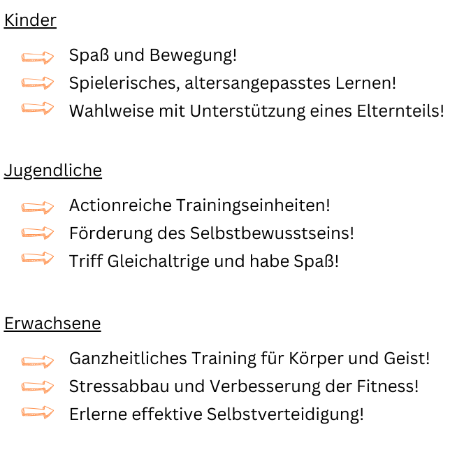 Daher stehen bei uns Werte wie Höflichkeit, Respekt, Bescheidenheit und Selbstbeherrschung im Vordergrund. Diese und weitere Werte zu vermitteln, ist ebenso Bestandteil des Trainings, wie das Erlernen von Schlägen, Tritten, Selbstverteidigungstechniken, Akrobatik, Fitness und vielem mehr!